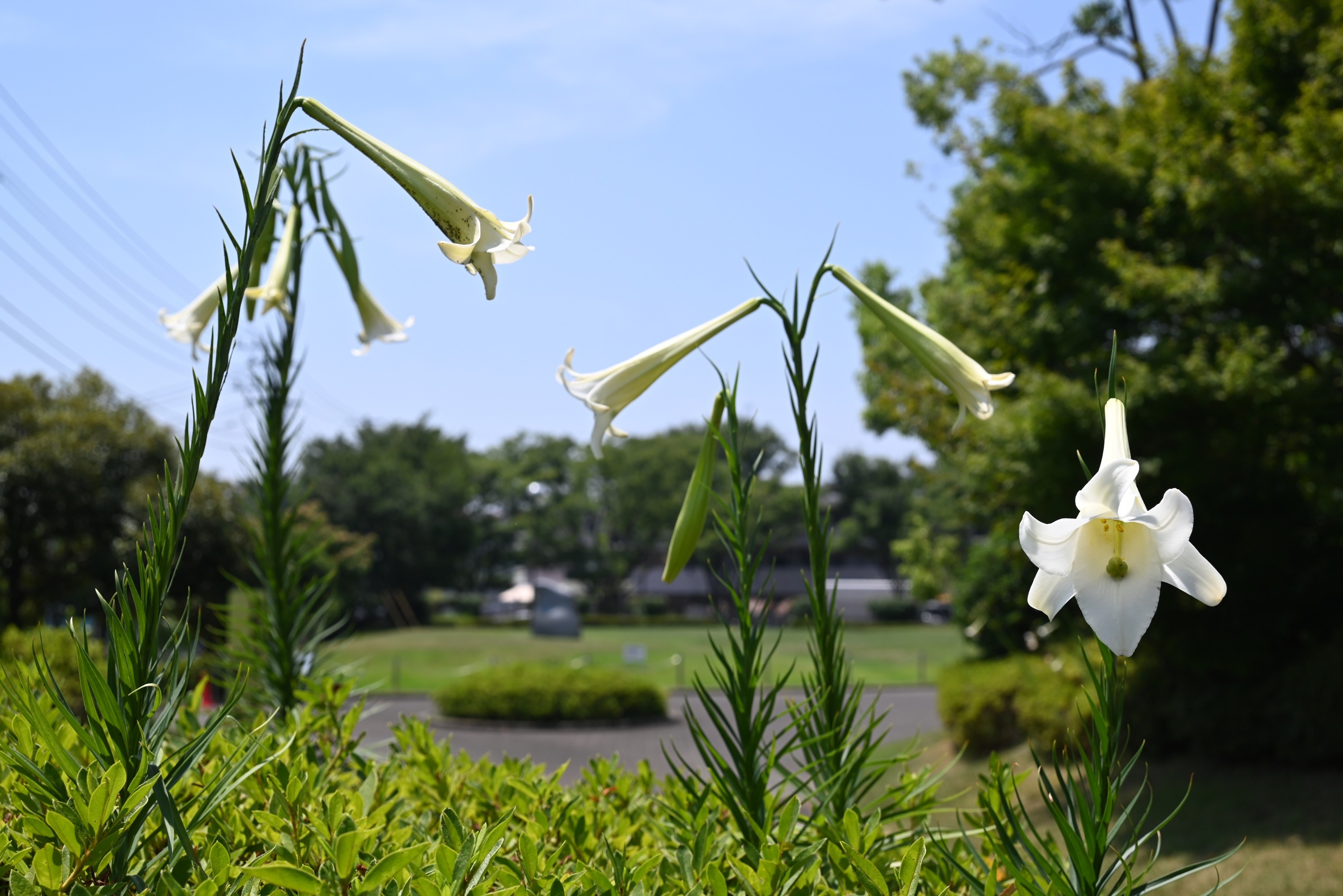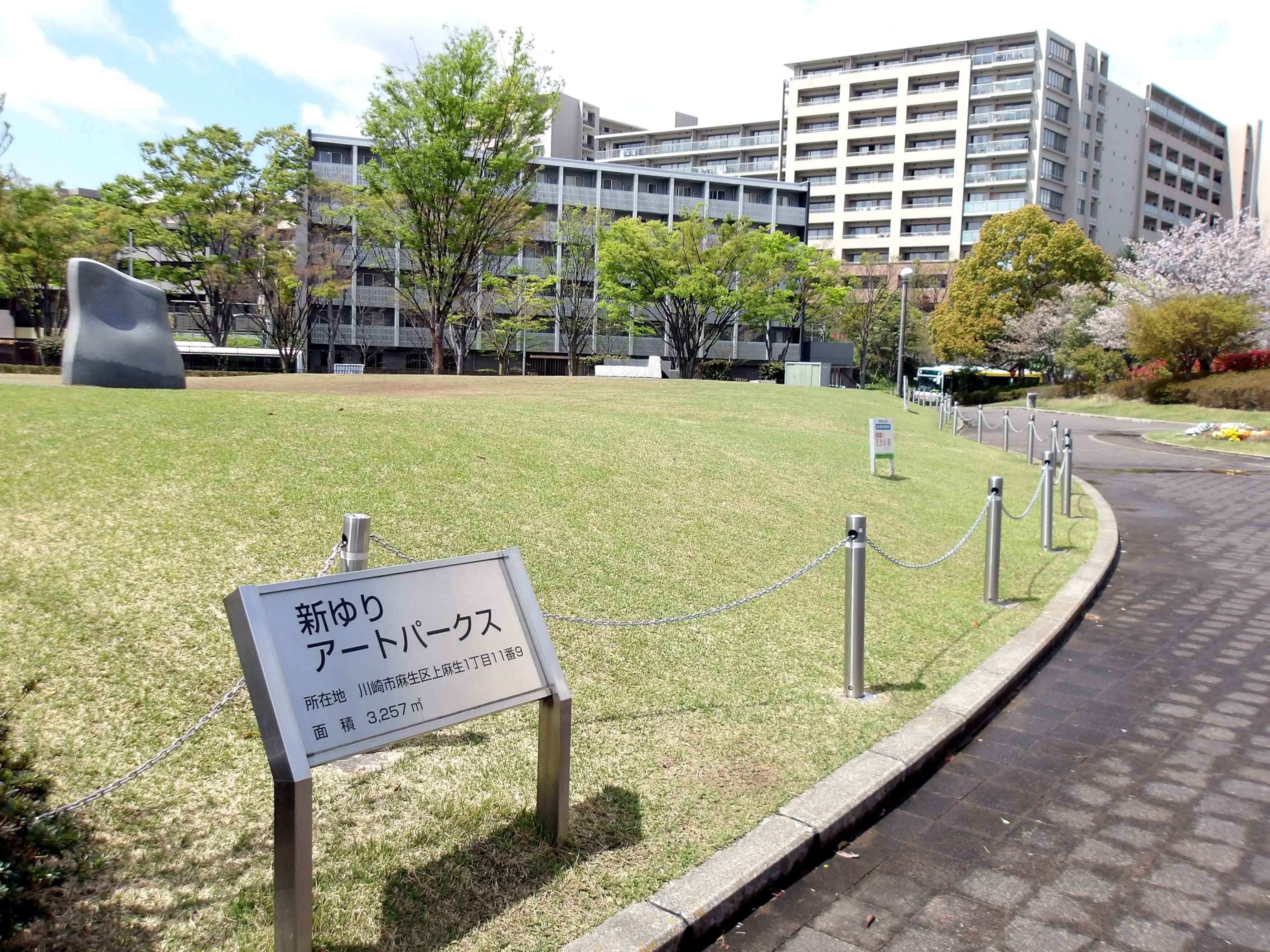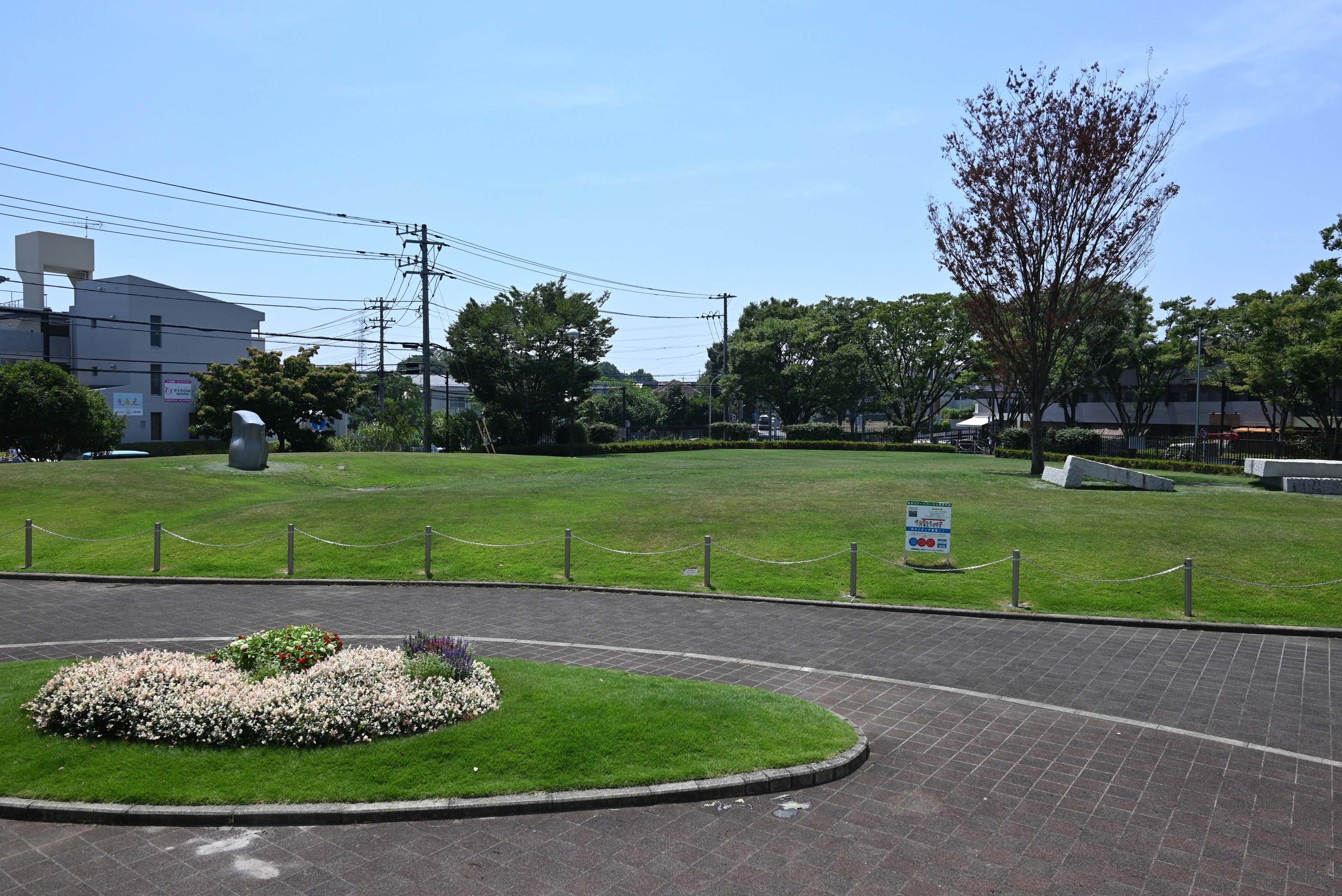 彫刻オブジェのある綺麗に整備された芝生公園。