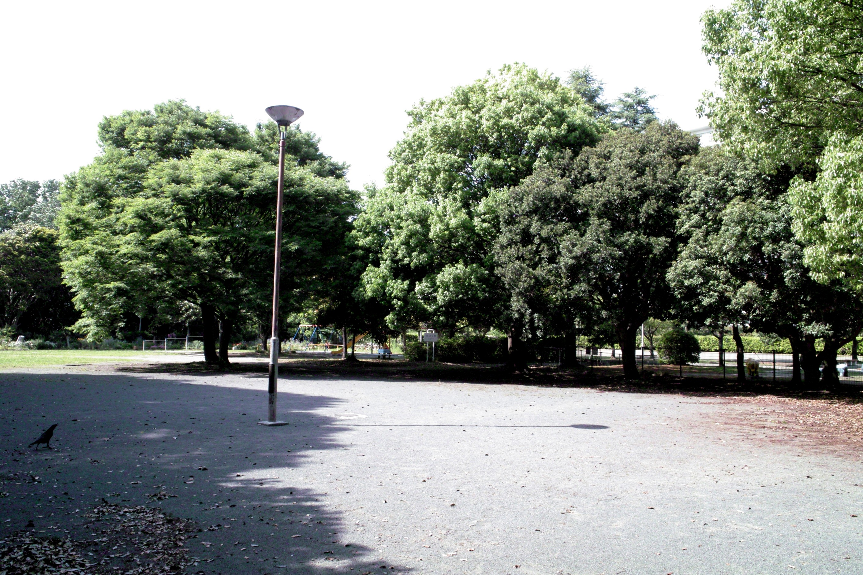遊具前に公園のシンボルツリー