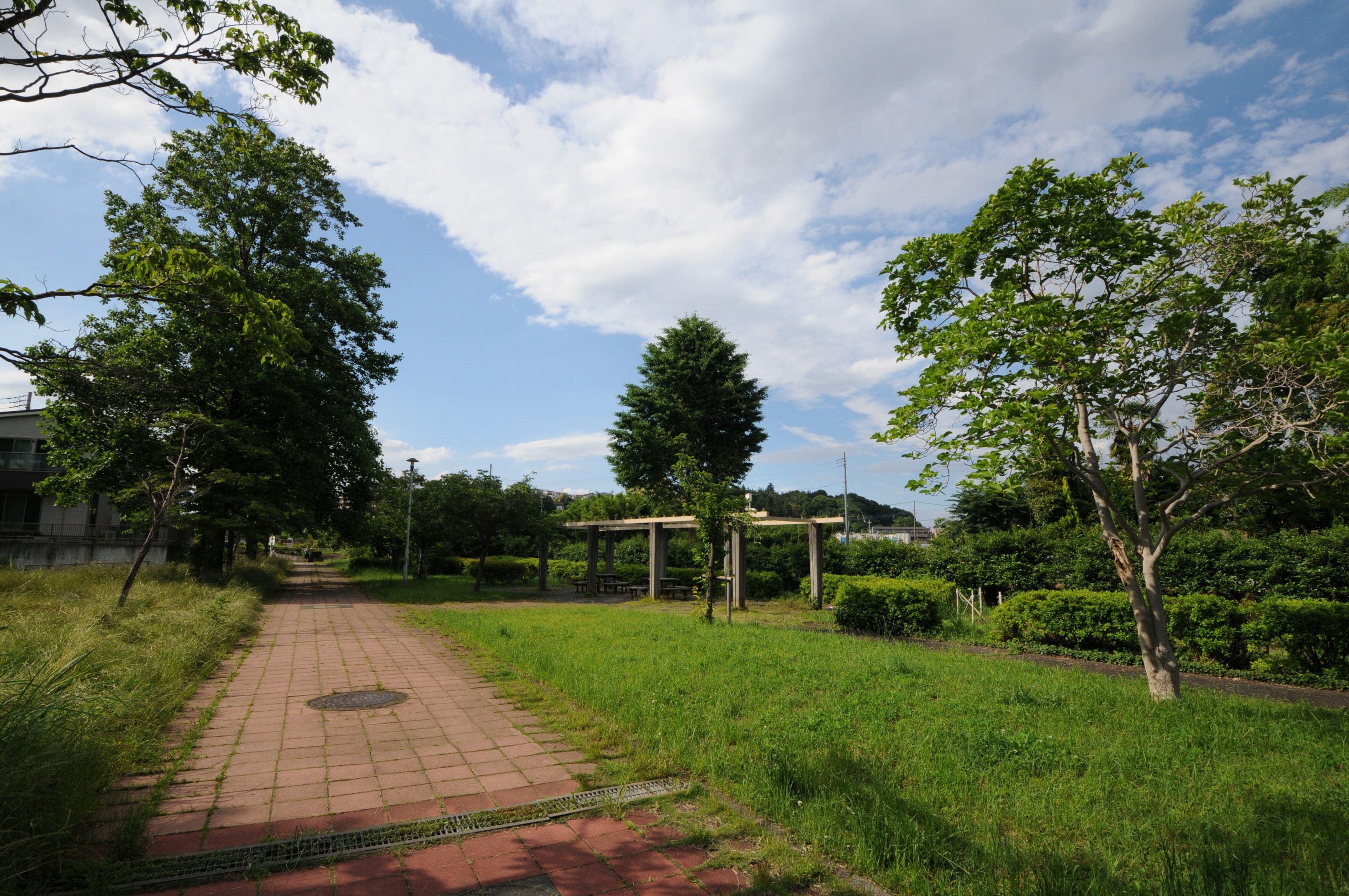 上麻生と町田市三輪町の市境に沿って延びる調整池に連なる公園
