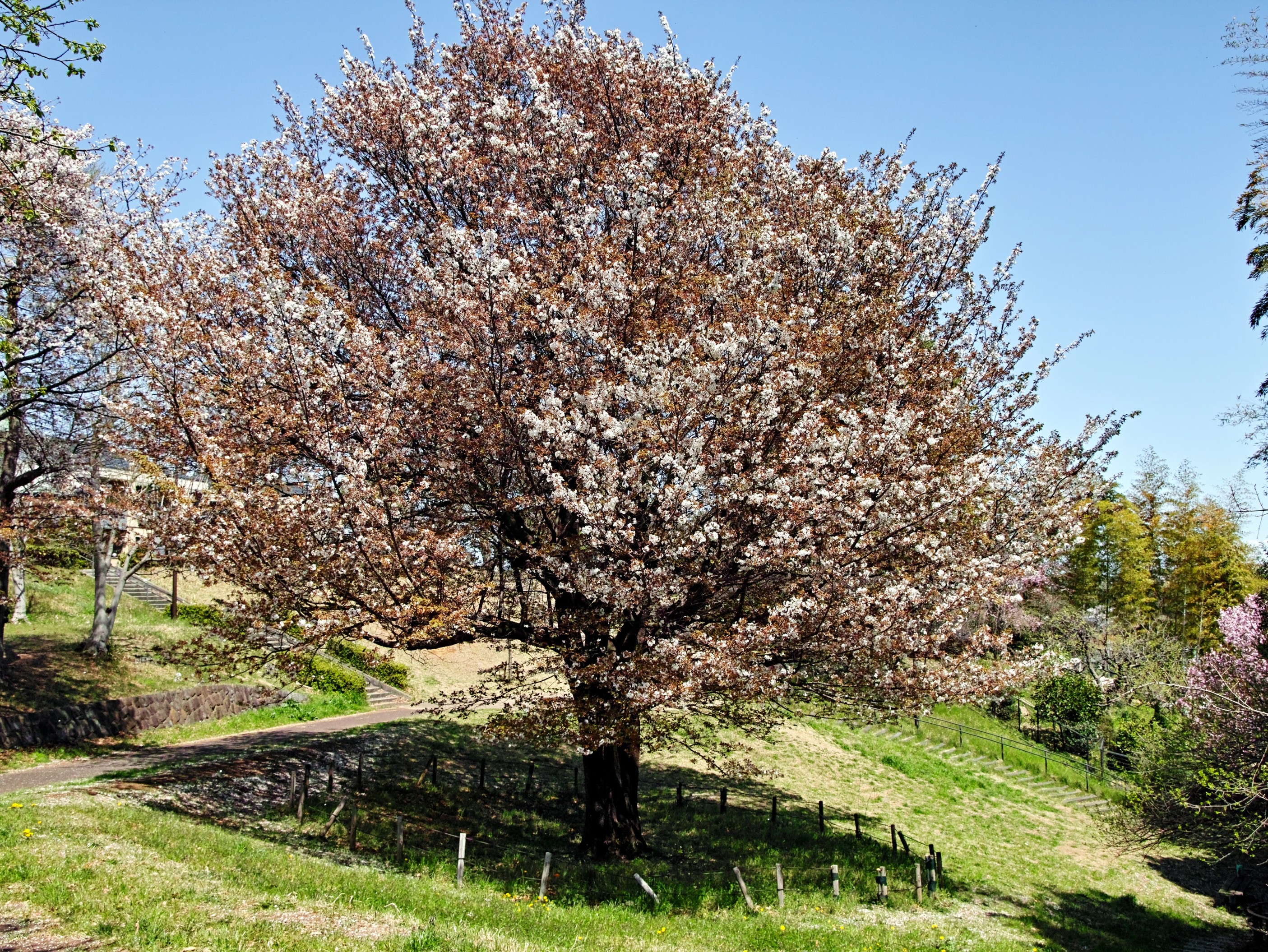 公園の中央には、黒川の山から移植した巨大なヤマザクラが立っており、